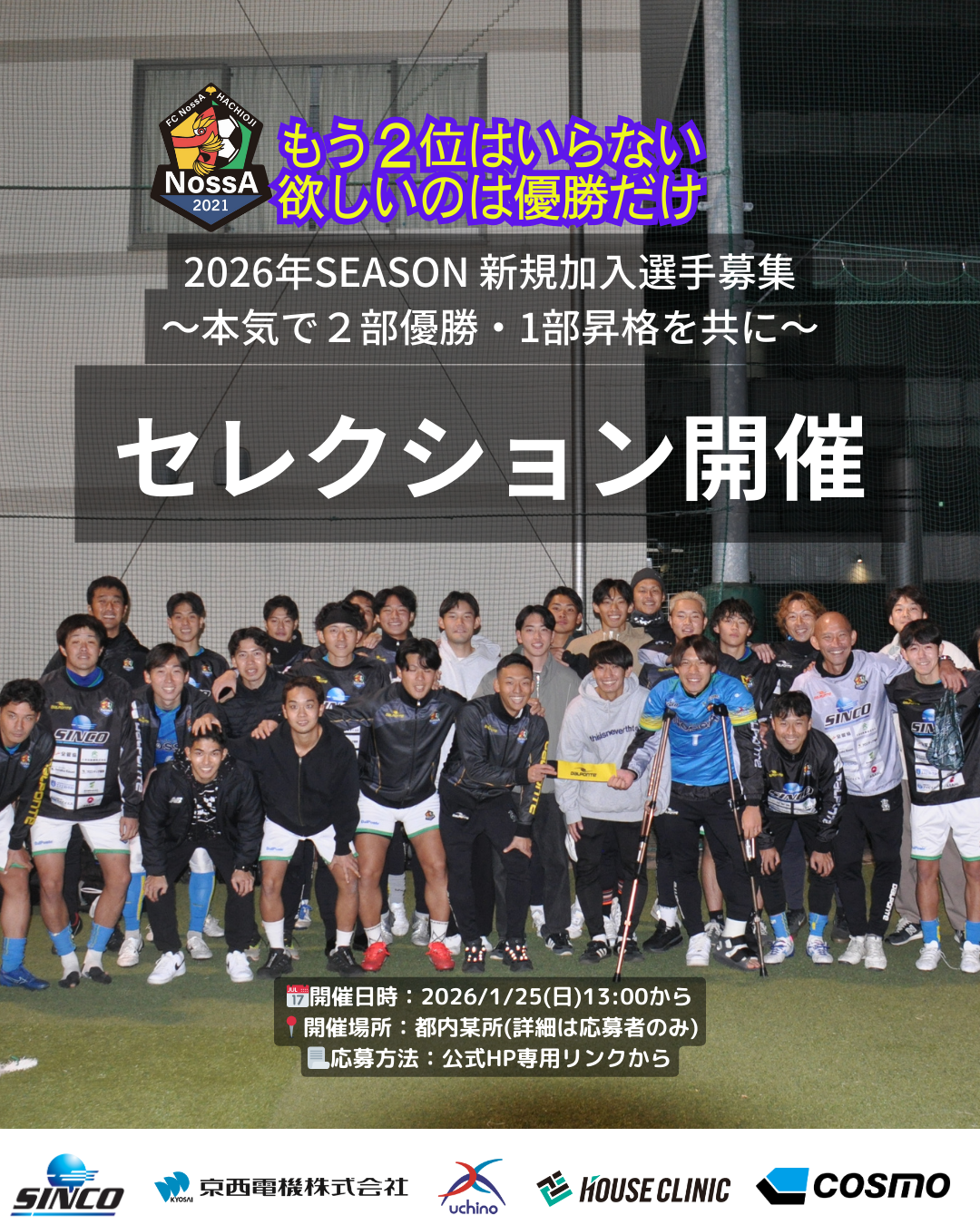 FC NossA八王子では、来シーズン東京都社会人サッカーリーグ2部で優勝・1部昇格をともに勝ち取るためにともに闘う、新規加入選手のセレクションを行います。